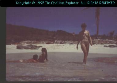 Aside from hiking and biking, there are scuba diving off Basse Terre and interesting snorkeling on Grande Terre, especially at Pointe Tarare, which has the clothing optional beach where this nude woman is wading. Usually the Atlantic side of Caribbean islands is unswimmable with cliffs and crashing surf; much of Guadeloupe's Atlantic side is that way. But Pointe Tarare reaches out and cuts off the heavy waves, and reefs absorb the rest. The beach is sandy and shaded in the mornings, and the cove is full of large rocks and reefs where fish and octopuses hide. One day as I waded knee deep into the water at Pointe Tarare, a small barracuda flashed by about two feet in front of me. I looked down at myself and thought, I wonder what he thinks is bait?
