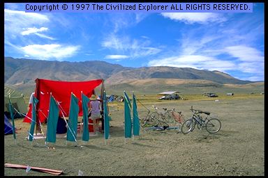 As we had last year, we brought carpet remnants. We were not able to locate one piece that was around 10 by 10 feet, so we brought three smaller pieces which, together, were even larger. This turned out better. The smaller pieces were much easier to get into and out of the van, and the larger carpeting area let us move around to stay in the shade but still on carpet. The carpeting was not staked, but gave no problems in staying put right on the ground; dirt, brush, and clods were blown onto it, but we swept it frequently and maintained a relatively clean place to sit and lay on. It was remarkable that people would not come onto the carpet with shoes on; they either removed their shoes or stood to the side. Where do you find people like this at home?