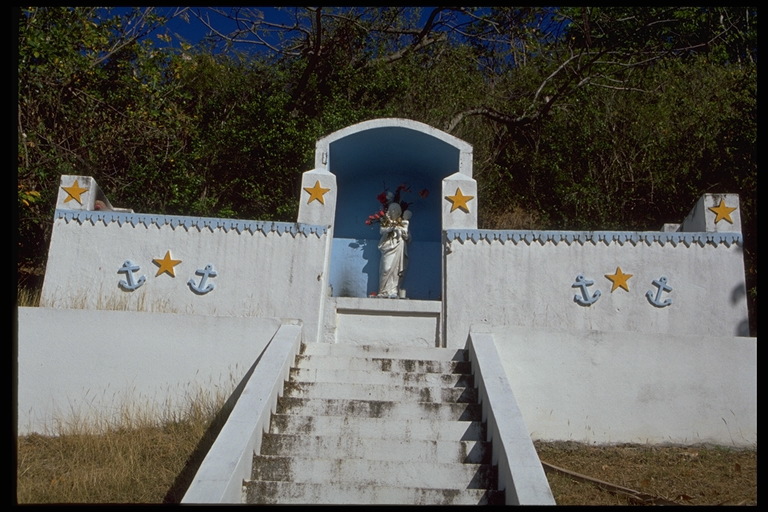 Terre d'Haute has a large crucifix in the hills above the harbor which gives a spectacular view of the harbor and the town below. Our panorama was made so close to the crucifix that it was not entirely visible. This page has links to photos of the crucifix and the shrine up the hill behind it.