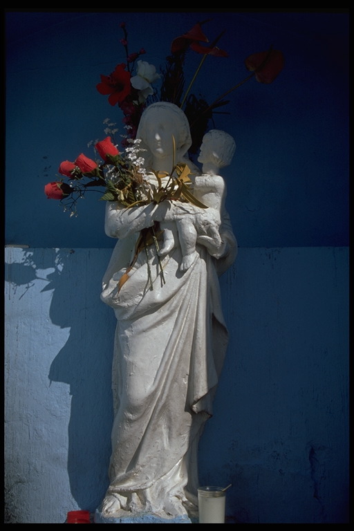 holds a bouquet of flowers in addition to the Child. Image size is about 512x768